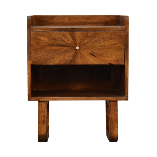 This chestnut bedside is ready to arrange anything you need becoming your perfect companion for storing. The sunrise design brings a more elegant and eye catching display while proving handy all over your home. It is made with 100% solid mango wood with a fine chestnut finish.