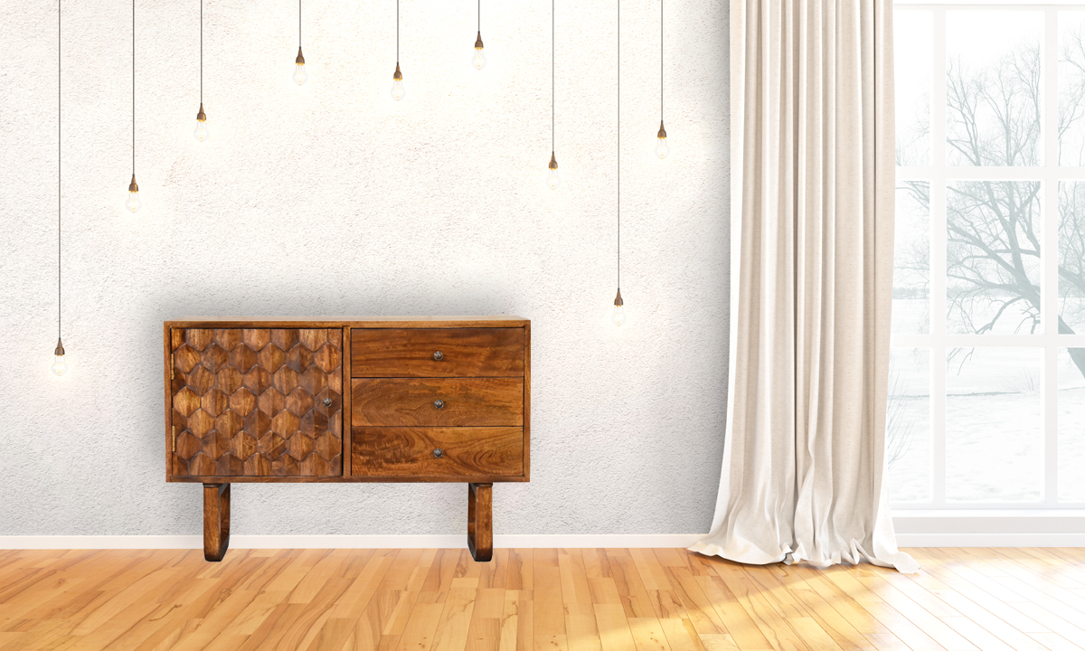 This chestnut sideboard features 3 drawers with plenty of room for whatever you see necessary. Its pineapple carved drawer is a fascinating and beautfully designed piece giving it an intriguing look helping to bring life to the product. Enjoy this item knowing it is made of 100% solid mango wood with a chestnut finish.