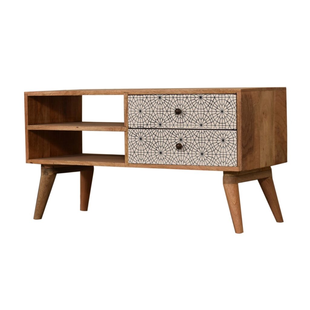 Add this simplistic yet versatile media unit to your living room or bedroom, featuring 2 large drawers which have knobs and 2 open slots for storing any books, magazines, or CDs. It also has ample space on top for a TV or any photo frames or ornaments. It has been constructed from 100% solid mango wood and has a fine oak-ish finish. It can stand alone or be partnered with the other pieces from the trestle range.