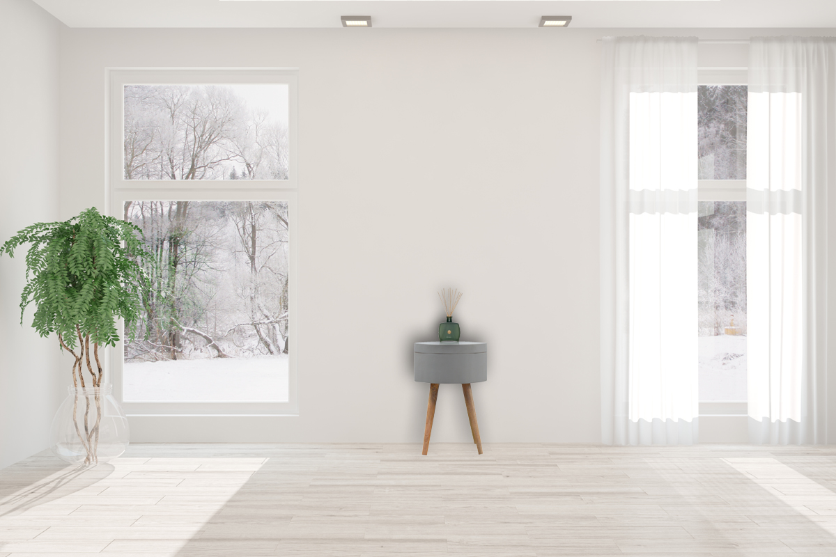 This round table and drawer unit is perfect for the side of the bed or sofa. It contains one deep drawer, providing ample storage space for any bits and pieces you wish to have close to you. It has been painted in a grey paint and features 4 Nordic style legs in an oak-ish finish.