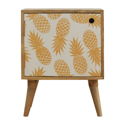 This bedside has been constructed from 100% solid mango wood and finished in a fine oak-ish finish body. The main features of this piece is the screen printed door front which has a beautiful pineapple design giving the piece extra dimension and character and allowing you to store any bits and pieces discreetly. It also has 4 Nordic style legs and ample space on top for a lamp, photo frames or ornaments.