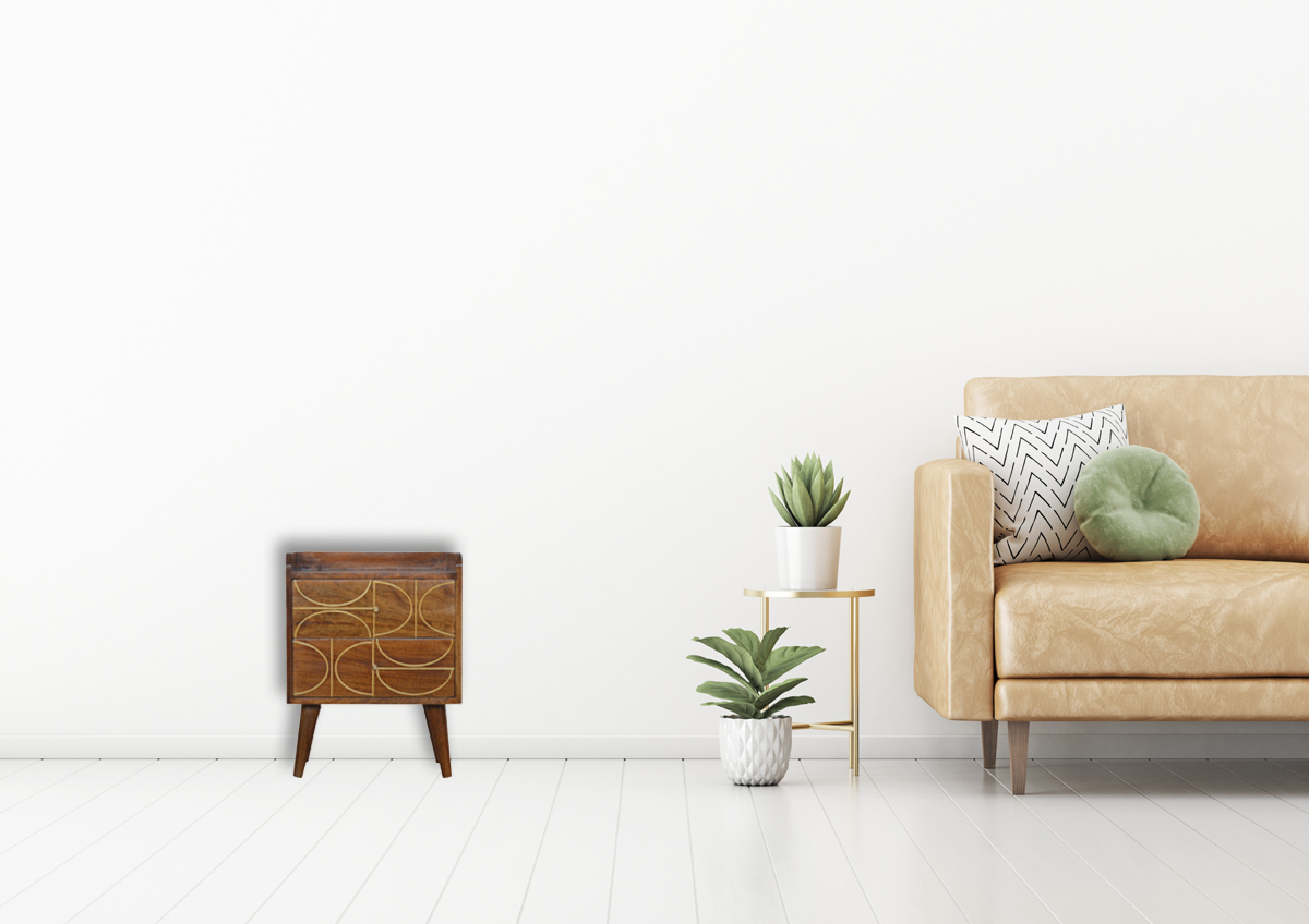 Constructed from 100% solid mango wood in a fine chestnut finish and offering storage space with the use of 2 drawers this stunning bedside will make the perfect piece for your bedroom. It features a gold brass abstract pattern on the drawer fronts and stands on 4 Nordic style legs. Add this gorgeous piece to your home.