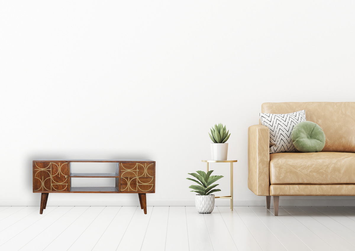 Constructed from 100% solid mango wood in a fine chestnut finish and offering storage space with the use of 2 open slots, 2 drawers and 1 door this stunning media unit will make the perfect piece for your living room. It features a gold brass abstract pattern on the door and drawer fronts and stands on 4 Nordic style legs. Add this gorgeous piece to your home.