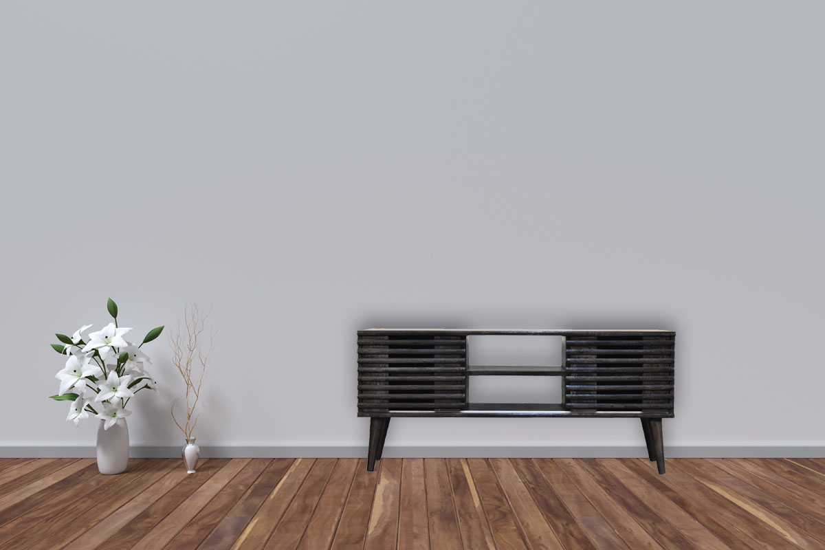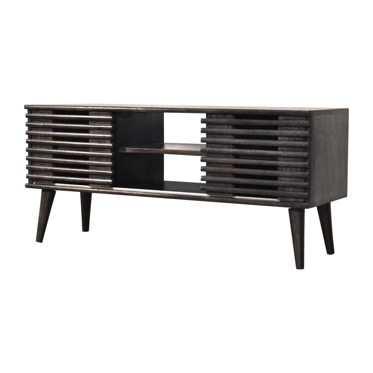 Perfect for storing and displaying the TV, speakers, or games consoles, our Kobe Media Unit is an ultra-practical piece with a trendy Mid-Century Modern meets Scandi look. Constructed from 100% solid mango wood in an ash black finish, this elegant piece of furniture showcases a ridged design on the cabinet doors giving the piece dimension and texture. Use it in the living room or an open-plan kitchen-living-dining space with a different zone for relaxing and entertaining.