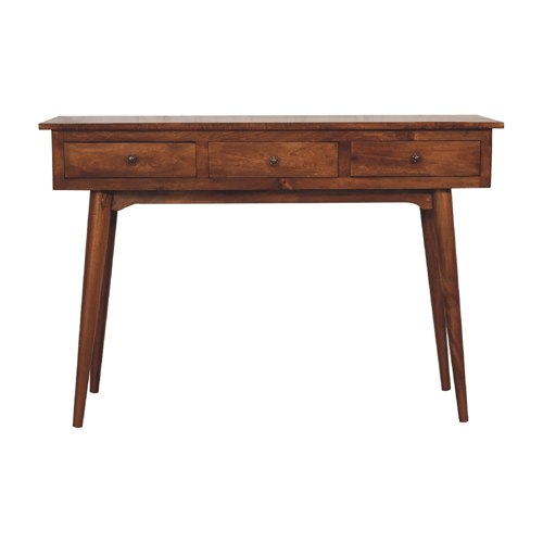 A twist on simple & elegant charm is what this practical large console table will provide. Suiting most interiors, this 100% solid mango wood unit has been built with sustainably sourced timbers in a Nordic wood design, with a chestnut finish and 3 spacious drawers to help keep your home organised when storing any household objects.