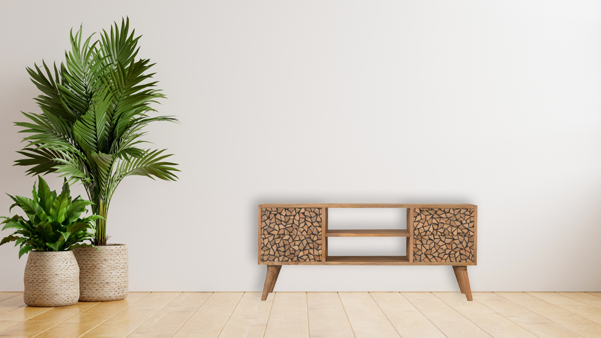 This media unit has been constructed from 100% solid mango wood in a oak-ish finish. It has 2 drawers and 2 open slots for storage convenience and features nordic style legs with shiny brass knobs which give a lovely contrast against the print. More items available from the Lisbon range.