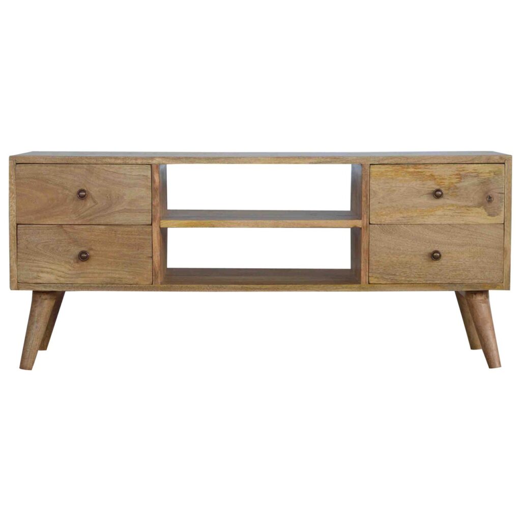 Enhance your living room with our Luca Media Unit. There are 2 open slots and 4 drawers with golden bar knobs on this piece, which offer a clean and classy finish. It can stand beautifully on its own or be paired with other pieces from the collection. This piece features a wonderful contrast between gold metal and wood and has been constructed from 100% solid mango wood in a chestnut finish.