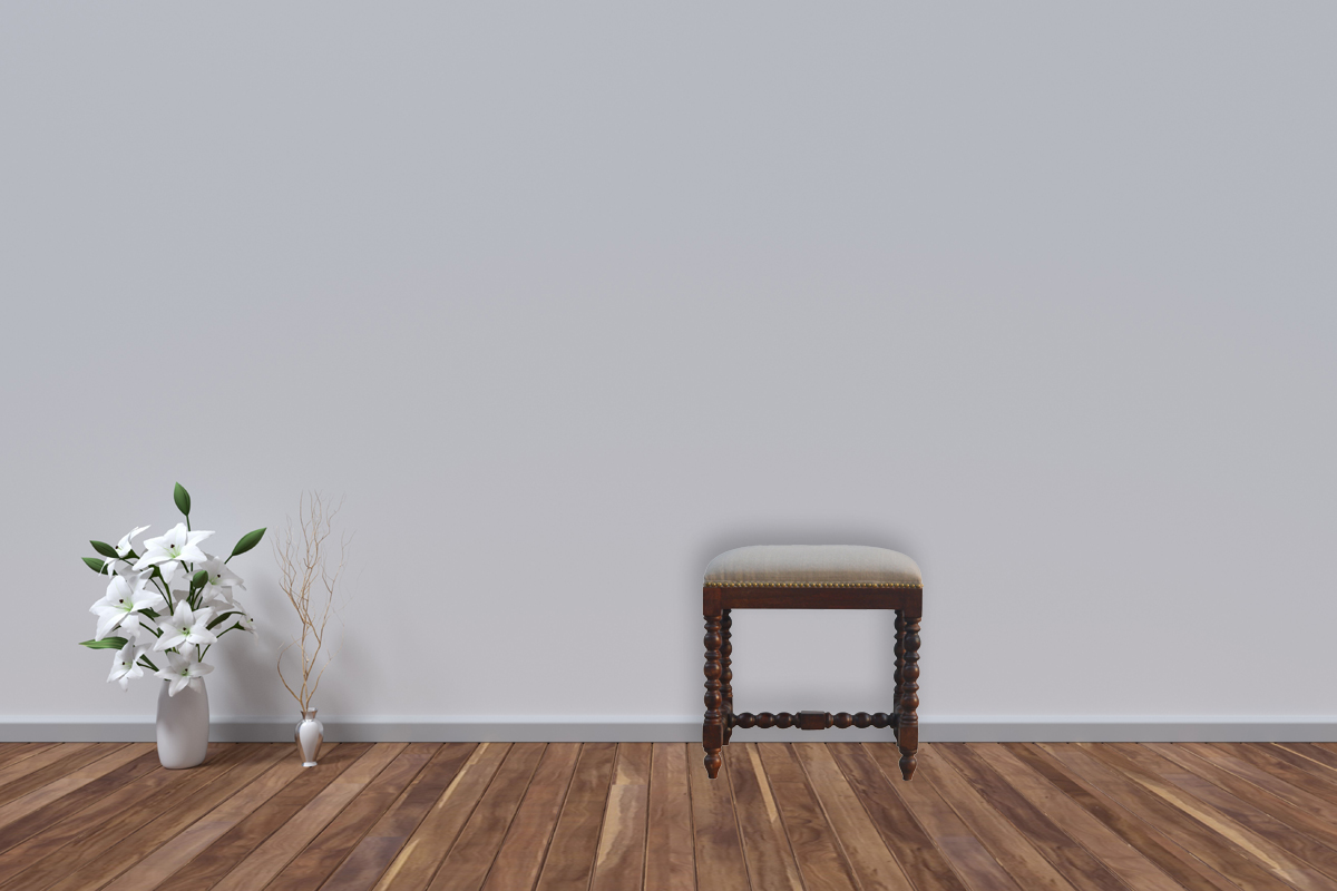 This footstool is a beautiful piece of furniture to add to your home. It is constructed from 100% solid mango wood and upholstered in white lily linen. Other features include antique brass studs around the upholstered top, and hand turned feet which have a smooth light walnut finish.