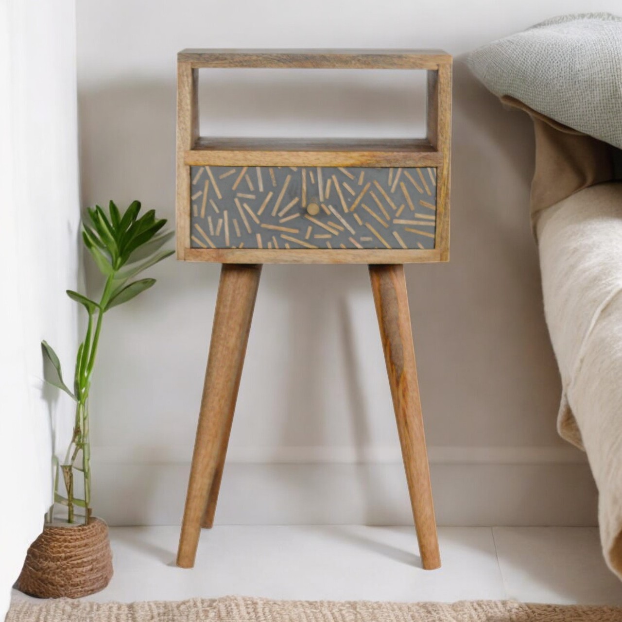 This beautifully designed bedside is constructed from 100% solid mango wood and has a oak-ish finish. Useful storage space is available with 1 drawer with a cement finish with a wood chip design, 1 shelf and a decent sized table top to place any ornaments. Other features include 4 Nordic wood style legs. This is a modern style which will suit most homes.