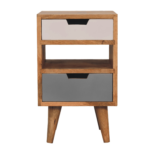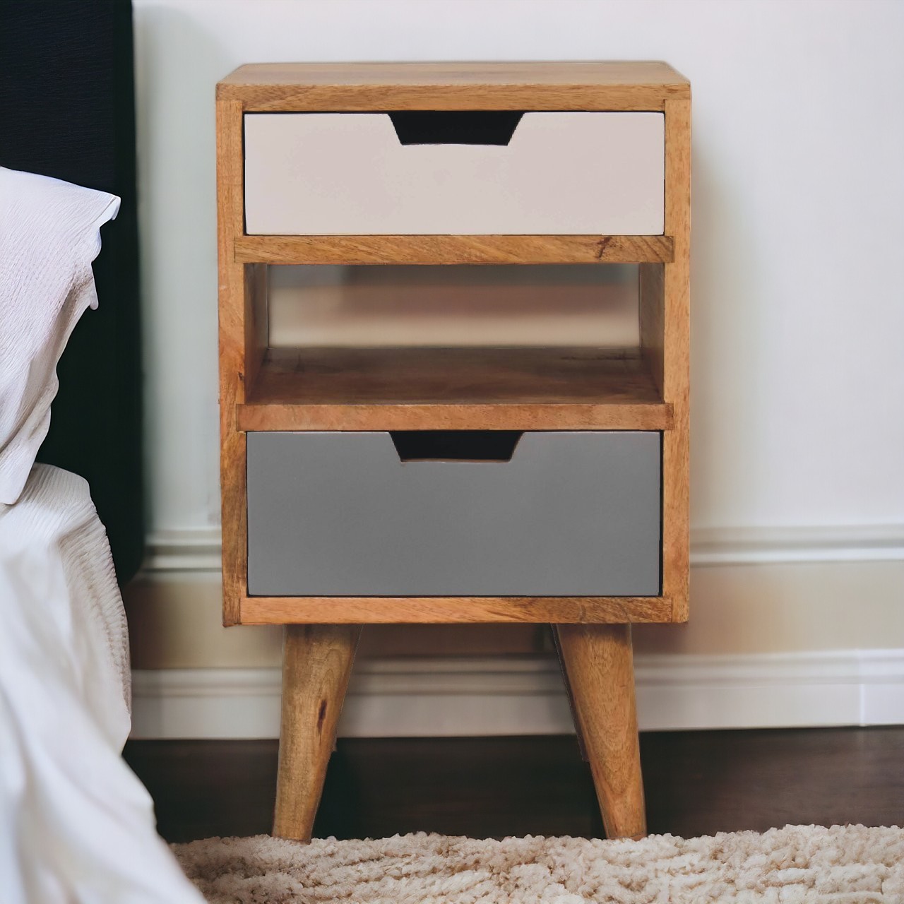 This mini white and grey gradient bedside has been constructed from 100% solid mango wood in an oak-ish finish and would be a perfect companion beside any bed, it stands on 4 Nordic-style legs and features 2 hand-painted grey and white handy drawers and 1 shelf in the middle. It can be partnered up with the other products from the range or stand-alone. A perfect addition to any home. This product is part of the Recession Collection.