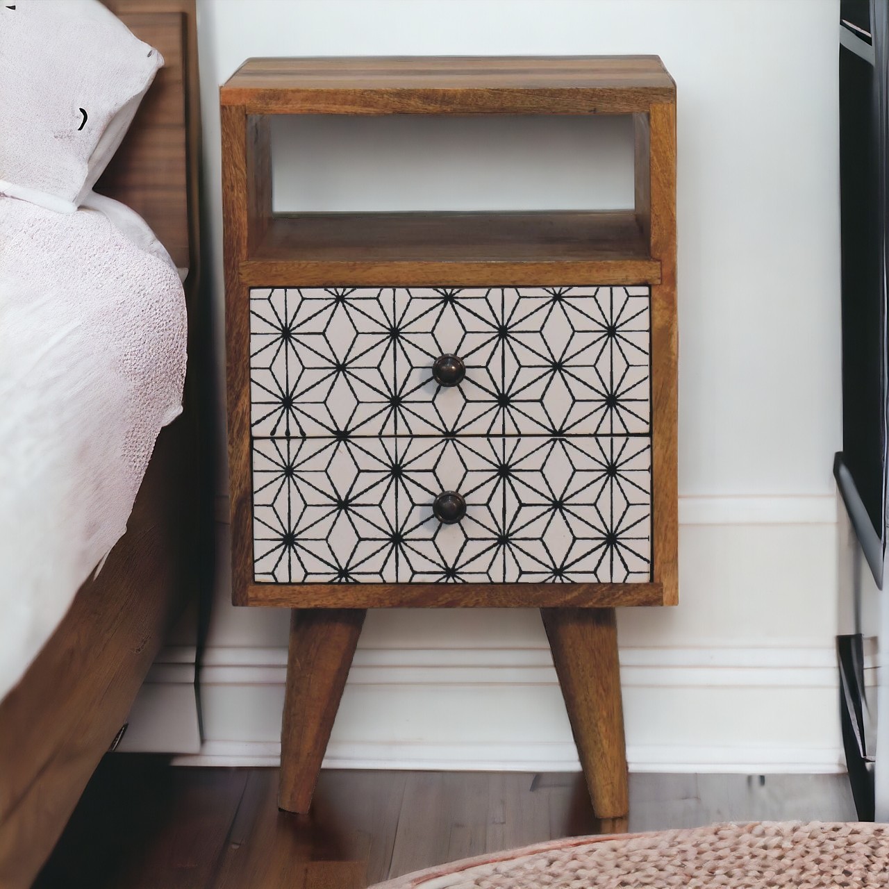 This mini 2 drawer bedside has been constructed from 100% solid mango wood and finished in a fine oak-ish finish. The main features of this piece are the 2 screen printed drawer fronts which have a beautiful black and white geometric design giving the piece extra dimension and character. Useful storage is provided with the open slot allowing you to keep any bits and pieces close before bedtime. It also has 4 Nordic style legs, knobs and ample space on top for a lamp, photo frames, or ornaments. This product is part of the Recession Collection.