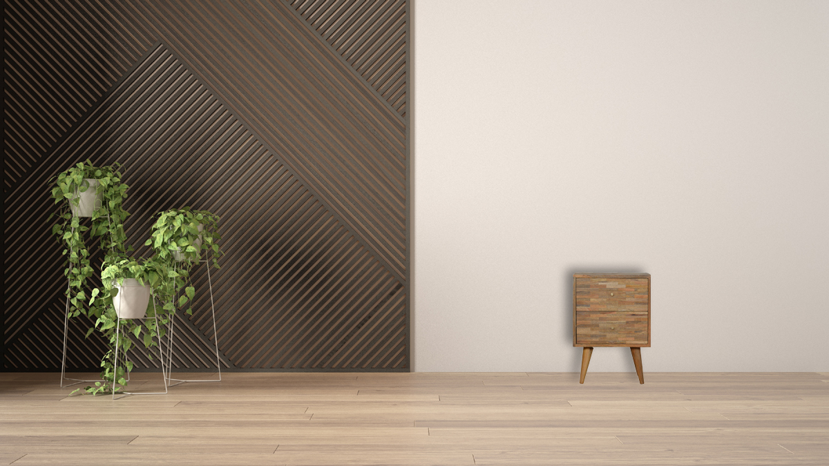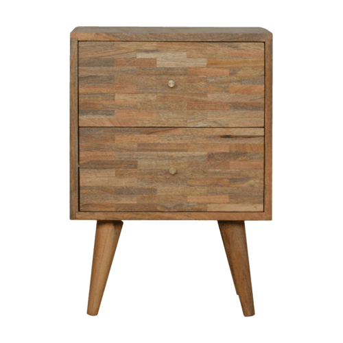 This bedside offers a contemporary and versatile style of furniture for today’s modern interiors. It has been constructed from 100% solid mango wood in an oak-ish finish and finished with a clear lacquer making the product durable and able to withstand years of use. It has a mixed pattern on the drawer fronts using different bits of wood and candle knobs for easy access to and from the drawers. The perfect buddy for your bed.