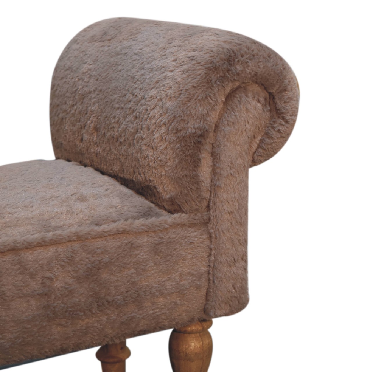 Upgrade your interior with this lovely mocha faux fur bedroom bench. Perfect for bedrooms or living areas, it offers versatile functionality as extra seating. It features turned legs made of 100% solid mango wood in an oak-ish finish. Whether placed in a hallway, at the end of a bed, or as standalone living room furniture, it adds a touch of modern elegance to any space.