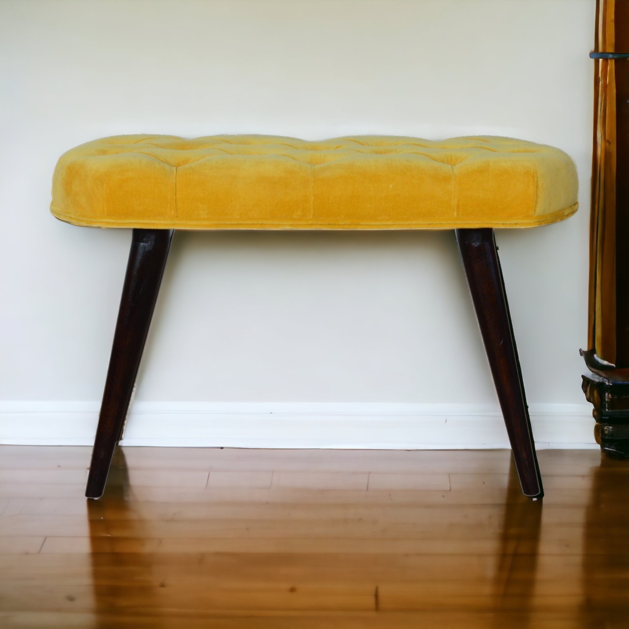 This Nordic style bench has been upholstered in a beautiful Mustard yellow cotton velvet fabric and features a classy deep-button design on the top. The bench stands on 4 legs constructed from 100% solid mango wood in a walnut finish and it is the perfect piece to add to your bedroom or hallway as a finishing touch in the home.