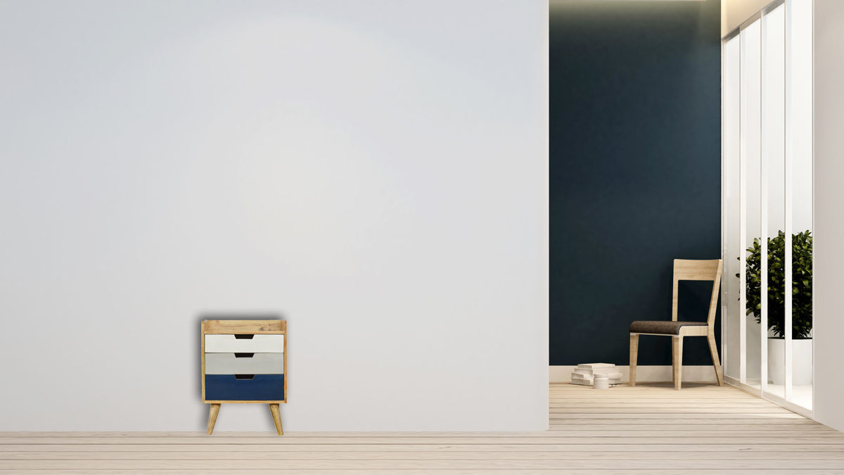 This Nordic gradient bedside table is the perfect stand for any bits and pieces you wish to keep nearby before bedtime. It features ample space for a lamp, photo frame or any ornaments. It has been constructed from 100% solid mango wood with a fine oak-ish finish body and 3 hand painted cut-out drawers in white, grey and navy. Some other characteristics include 4 Nordic style legs and cut out slots for easy access to the drawers. A lovely pop of colour and addition to the home.