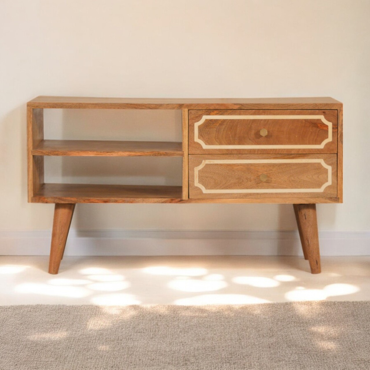 Constructed from 100% solid mango wood. This media unit features 2 open slots and 2 and Bone Inlay drawers suitable for use in the living room. It has a sleek compact design with Nordic style legs and shiny knobs.