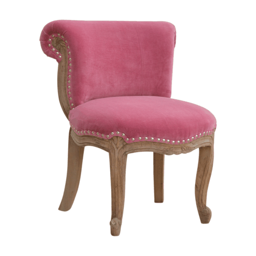 Add class and style to your home with this occasional chair. The upholstered pink cotton velvet fabric goes beautifully with the studded design giving the piece an overall unique and chic look. With solid wooden legs constructed from 100% solid mango wood in a sunbleach finish, the chair provides strength and durability and can be incorporated in different home settings and interiors.