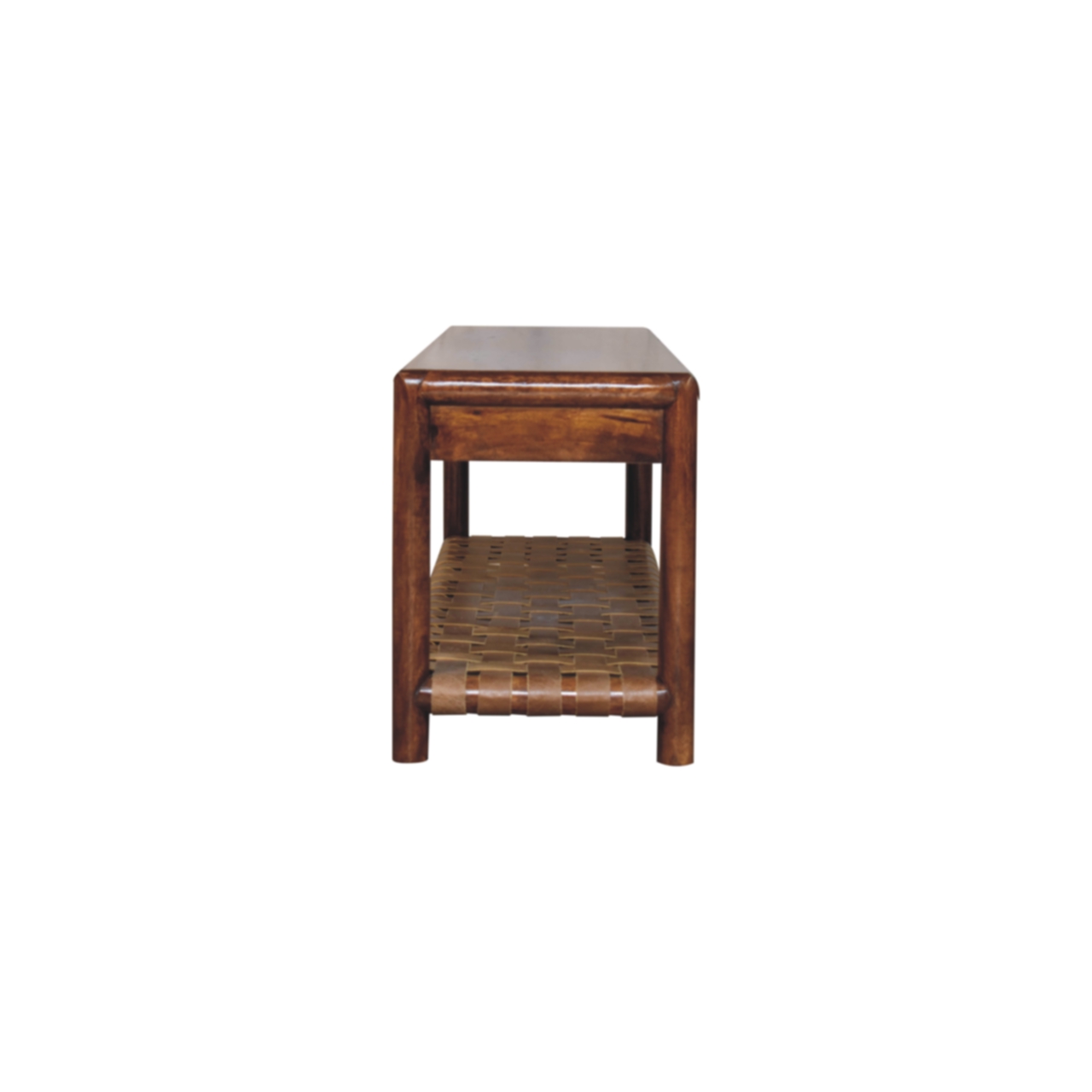 Introducing the Regency Woven Bench, a harmonious blend of style and functionality. Handcrafted from 100% solid mango wood in a rich Chestnut finish, this elegant bench features a unique braided bottom shelf, perfect for storing or displaying essentials like baskets, shoes, or decor. With its sleek design and sturdy construction, this bench is ideal for entryways, bedrooms, or living spaces, adding both charm and utility. The Regency Woven Bench effortlessly combines timeless aesthetics with practical storage, making it a versatile addition to any home.
