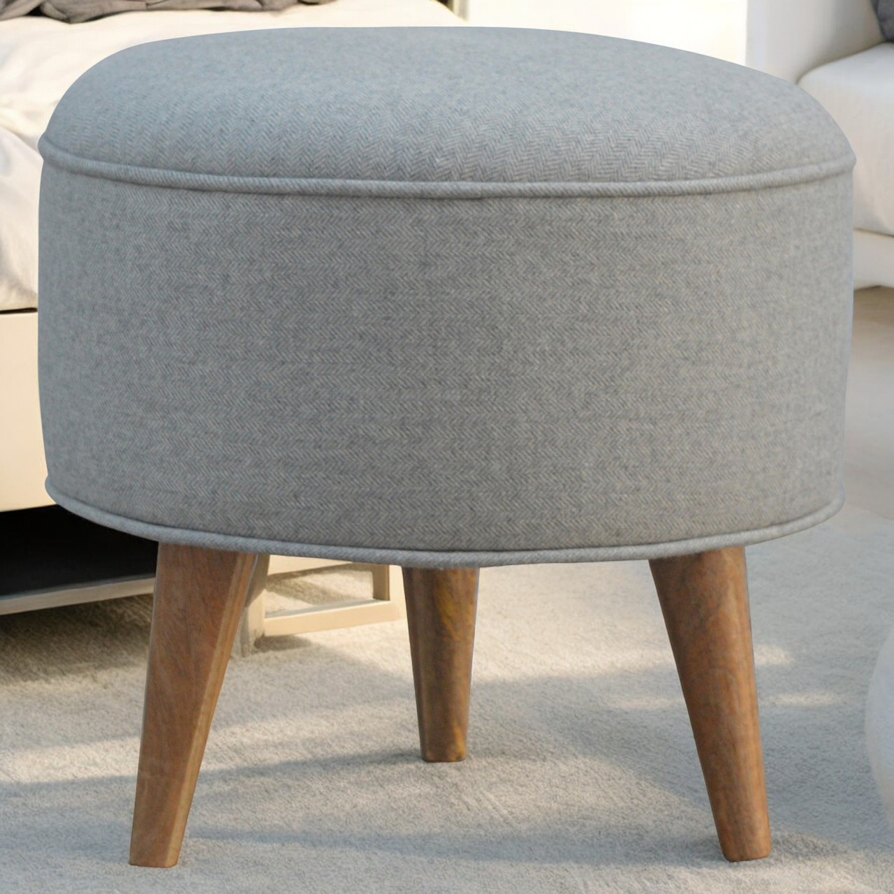 This round Nordic tweed style footstool is constructed from 100% solid mango wood and upholstered in woolen grey tweed. Other features include Scandinavian styled feet which have a beautiful fine oak-ish finish. It is the perfect accent piece to add to any room in the house.
