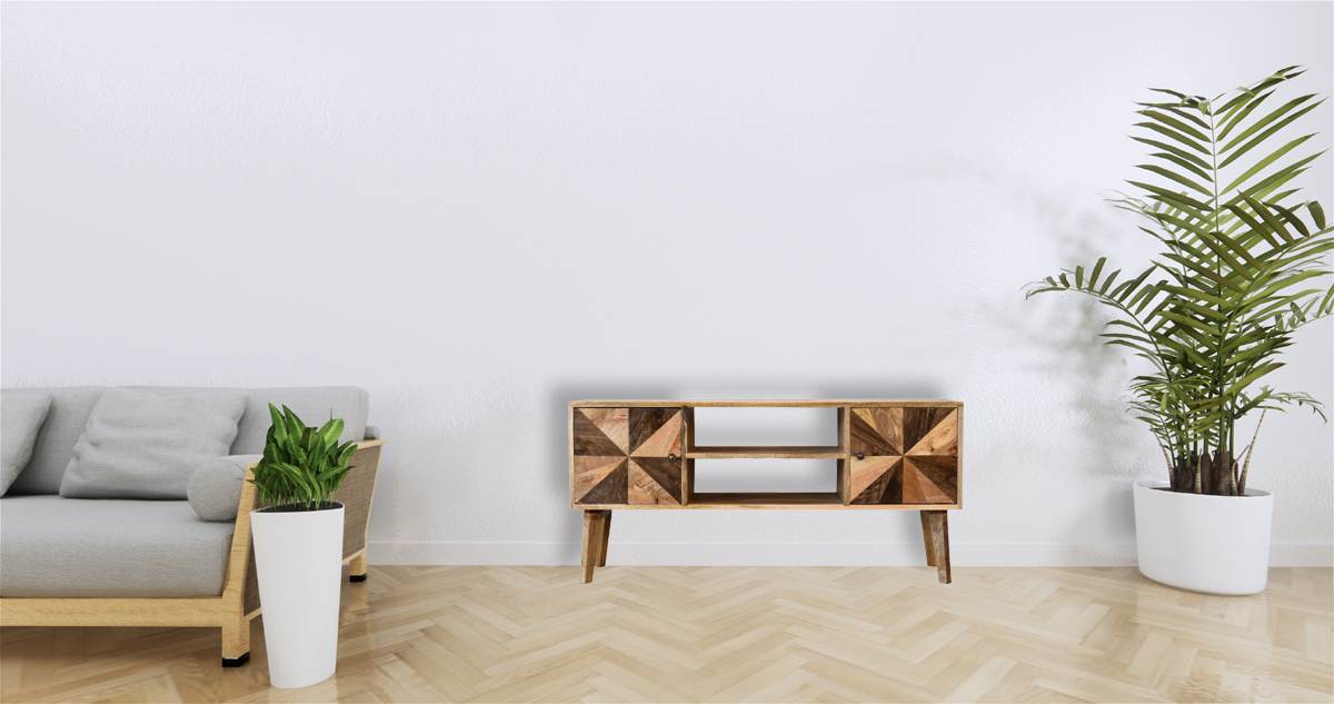 A beautiful addition to your bedroom, this Safi Media Unit features a contemporary, stylish design. Finished with a unique mixed wood door front this piece will look smart in almost any decorating scheme. It is constructed from 100% solid mango wood and also features 2 large open slot, shiny brass knobs and nordic style legs.