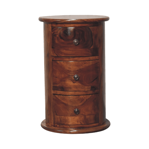This beautiful round three-drawer drum chest is made from 100% Sheesham wood and has a fine honey with shiny knobs on the drawers. The three spacious drawers are perfect for storing small items and the space on top is perfect for displaying plants, candles, or photos. This product can be used as either a chest, end table or an occasional table in the home