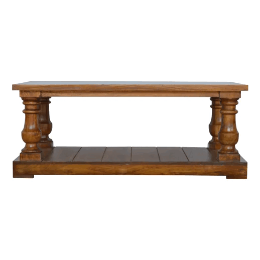 This coffee table is the perfect addition to a living room, feauturing a rustic, country design and 4 turned legs for added detail. It has been constructed from 100% solid mango wood in an oak-ish finish and offers one shelf which can be used to disreetly store any belongings like books, magazines or paperwork. It’s design makes it a versatile piece which can be incoporated with other furniture products or stand individually