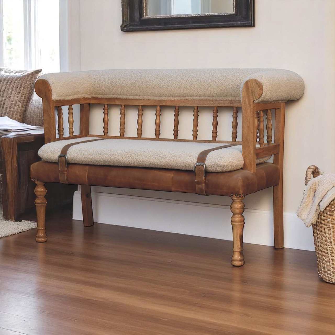 Add some luxury style to your home living area with this fabulous carved hallway bench. It is constructed from 100% solid mango wood in an oak-ish finish and upholstered in 100% cream boucle which is presented on the seat and backrest. Other features include buffalo leather buckle straps which can be secured or undone and hand turned front legs.