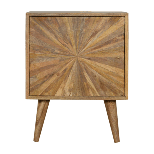Showcasing the sunrise patterned door, this bedside table has been constructed from 100% solid mango wood in a oakish finish. Offering a modern retro aesthetic, this bedside is a timeless option for your bedroom.