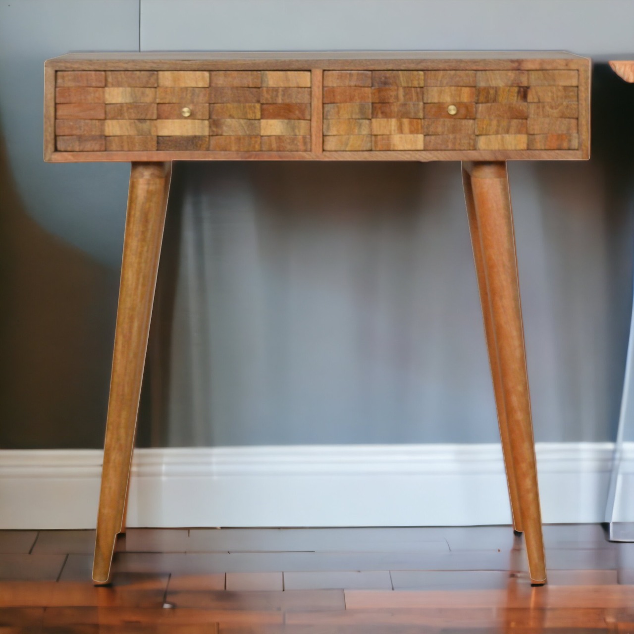 This console table has been hand crafted from 100% solid mango wood in a oak-ish finish. It features nordic style legs with 2 drawers which feature shiny candle knobs. This piece offers a subtle tile hand carved design on the drawer fronts which will create a modern look in your home and can be paired nicely with the rest of the collection.
