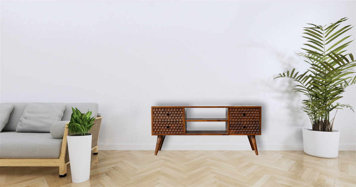 Featuring an attractive circular cut-out design on the drawer fronts, the Torun Media Unit is sure to make a stunning statement piece for any living room. Featuring a chestnut finish on the wood, complete with nordic style legs and round cut-out slots for easy access into and from the drawers this soft-assembly console table offers storage with 4 spacious drawers and 2 open slots as well as ample space on top for a TV or displaying plants ornaments etc.