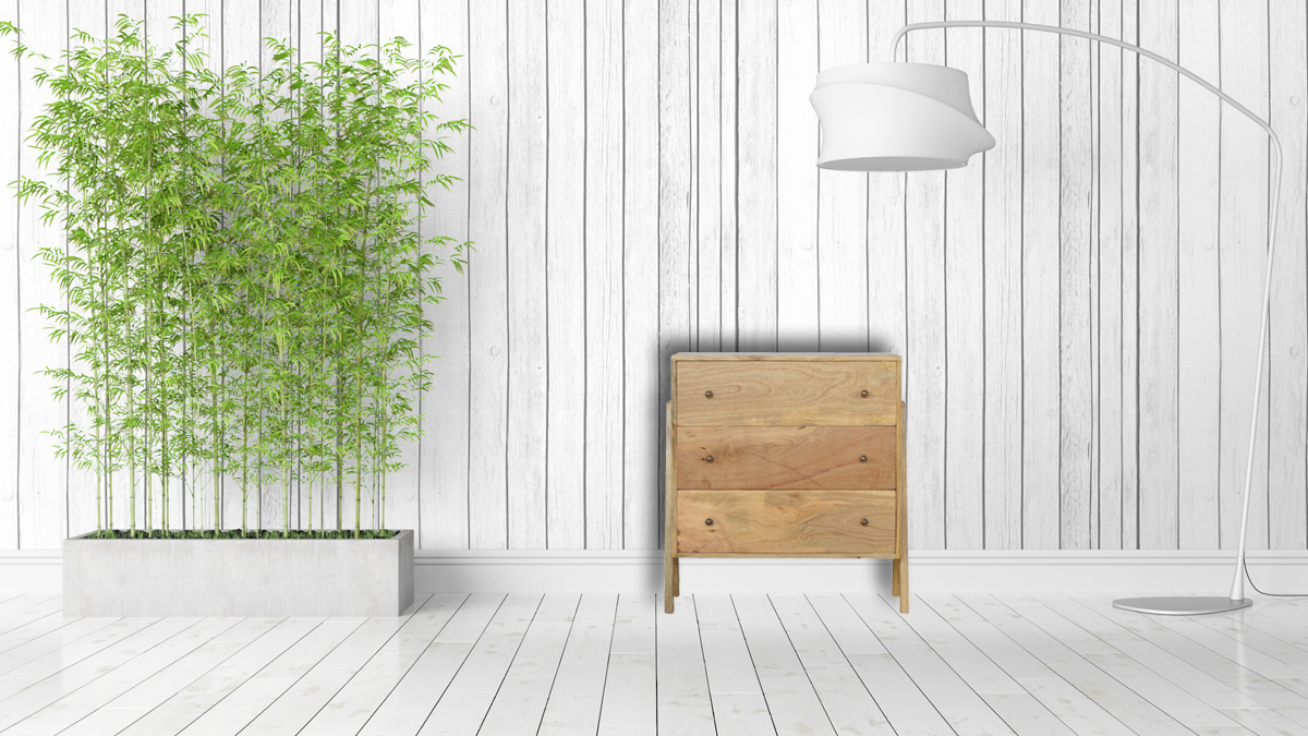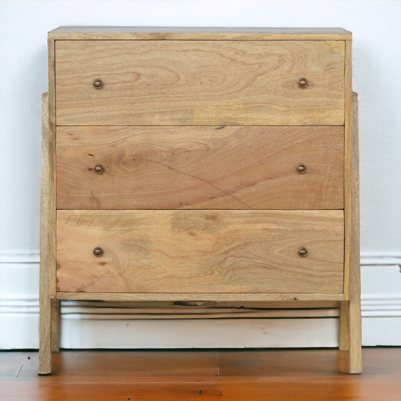 Featuring a unique Trestle design this chest of drawers comes with 3 large spacious drawers, which have shiny knobs each allowing easy access into the drawers. The piece has been constructed from 100% solid mango wood in an oak-ish finish meaning its simple yet modern design can be fitted into many interiors and be suited with any style and colour of the furniture. It can stand alone or be partnered with the other pieces from the Trestle pieces.