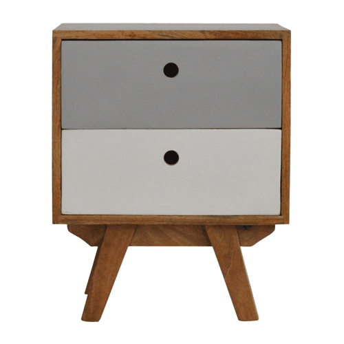 This Nordic style bedside table is constructed from 100% solid mango wood in an oak-ish finish and features 2 drawers hand painted in two tons of grey with 2 cut out open slots for easy access into the drawers. It can be used to store any bits and pieces before bedtime and can be incorporated with many interior styles for both modern, city homes and apartments. It is a versatile product which can stand alone or be paired with the other pieces from the range.
